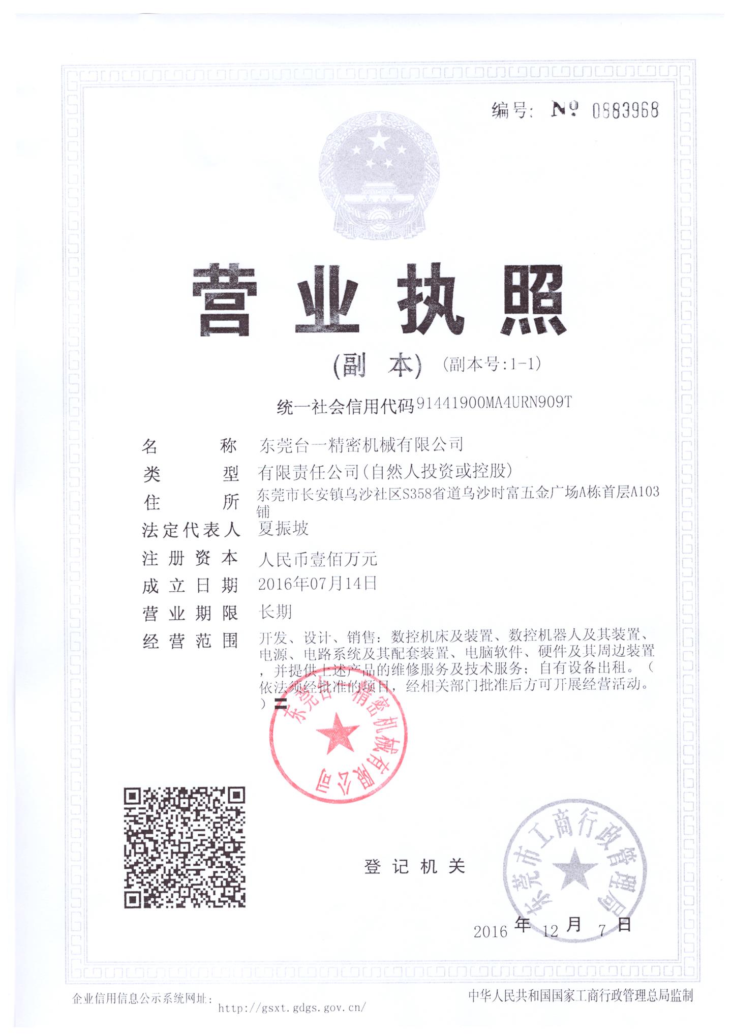 | 公司简称 | 东莞台一机械 | 企业类型 | 其他性质 |